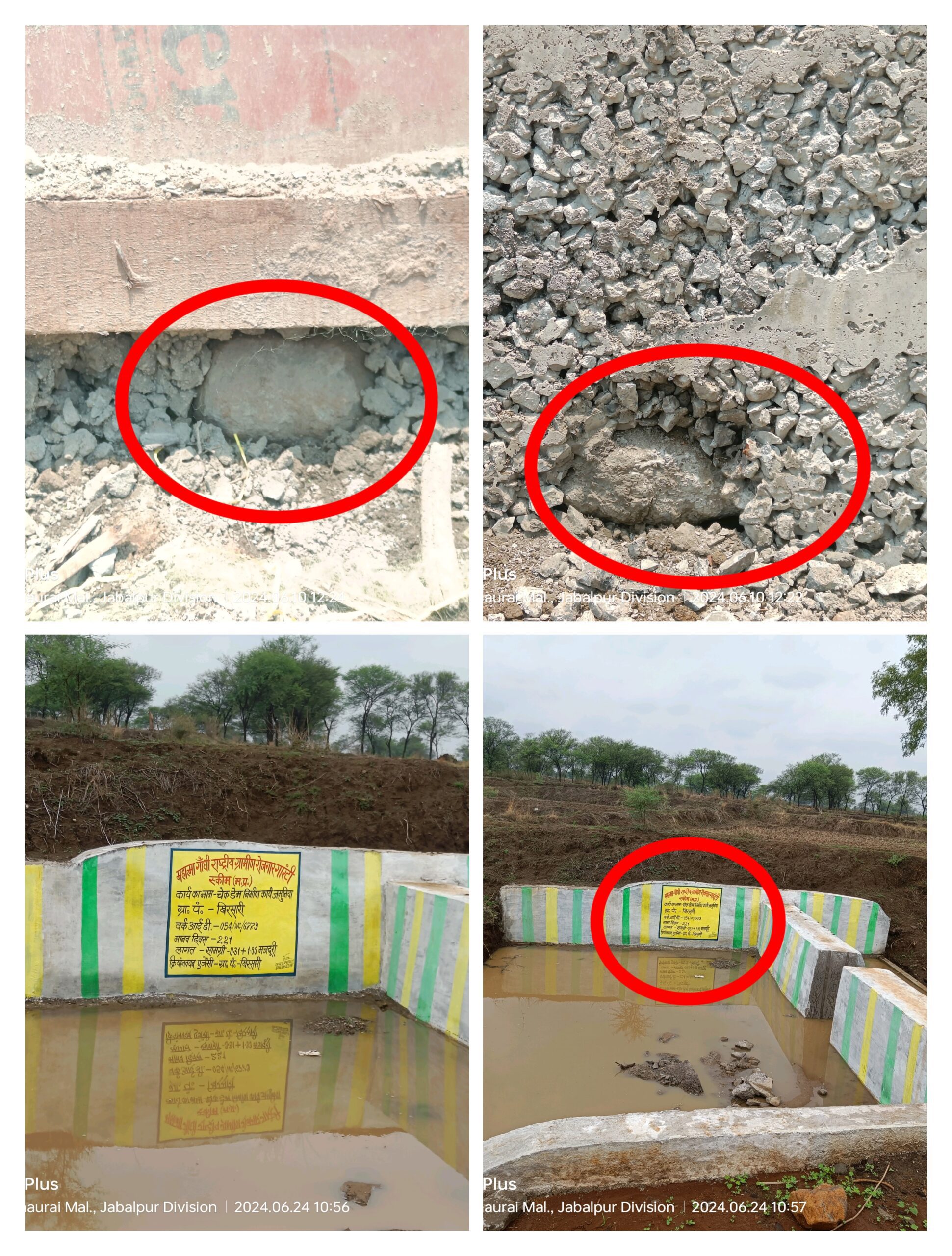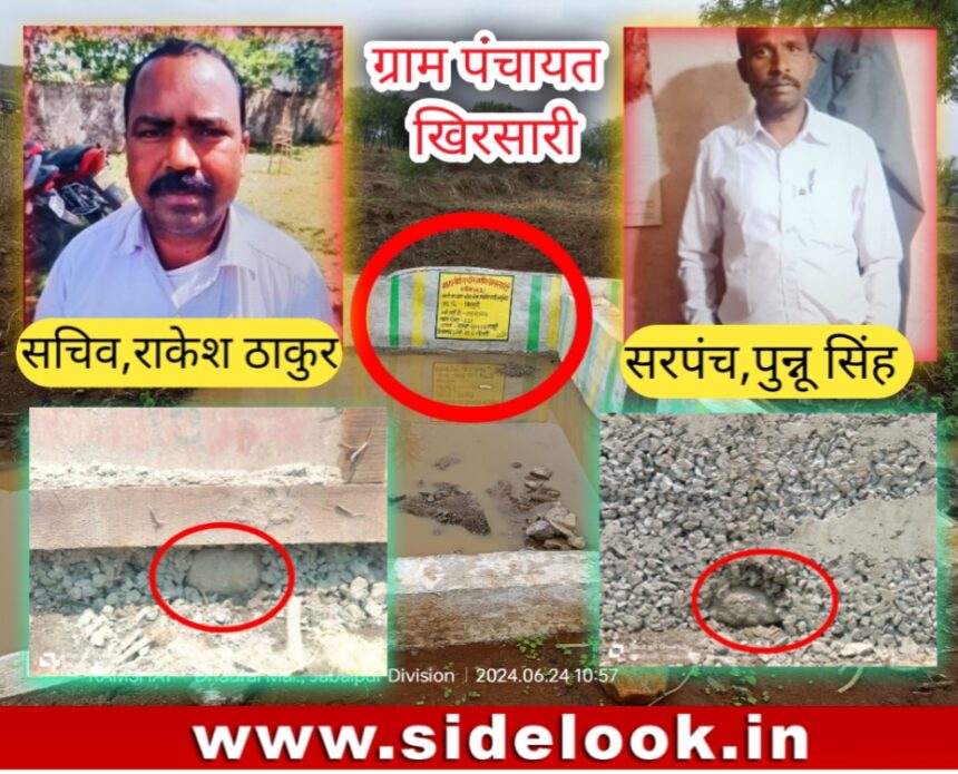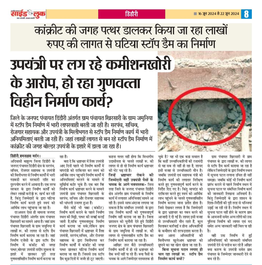 डिंडौरी, रामसहाय मर्दन| जिले के जनपद पंचायत डिंडौरी अंतर्गत ग्राम पंचायत ख़िरसारी के ग्राम जमुनिया के पटपहरा नाला में ग्राम पंचायत के द्वारा महात्मा गांधी राष्ट्रीय रोजगार गारंटी योजना के तहत ठेकेदार के माध्यम से 11 लाख रू की लागत से स्टॉप डैम का निर्माण कराया गया है। जहां ग्राम पंचायत के जिम्मेदारों के द्वारा भारी लापरवाही बरती जा रही है। बता दे कि स्वयं को आर्थिक लाभ पहुंचाने ग्राम पंचायत सरपंच, सचिव और रोजगार सहायक ठेकेदार से मिलीभगत कर स्टॉप डैम में बोल्डर, पत्थर डालकर गुणवत्ताहीन कार्य को अंजाम दिया गया है। स्टाॅप डैम निर्माण में कंक्रीट की बीच– बीच की जगह में पत्थर,बोल्डर डाला गया और 20 एमएम गिट्टी की जगह 10 एमएम गिट्टी उपयोग किया गया है जिसकी बानगी निर्माण स्थल में पडे निर्माण सामग्री, स्टॉप डैम पत्थर और अपलोड फोटो, वीडियो अपनी दस्ता बंया कर रही है। वही निर्माण कार्य के मसाले में सीमेंट, रेत ,गिट्टी की सही मात्रा में उपयोग नहीं किया गया जिसकी वजह स्टाॅप डैम निर्माण कार्य पूरा होने से पहले ही साइड वाॅल की गिट्टी निकलने की पूरी खबर साईड लुक समाचार पत्र में विगत दिनों प्रमुखता से प्रकाशित किया गया था।