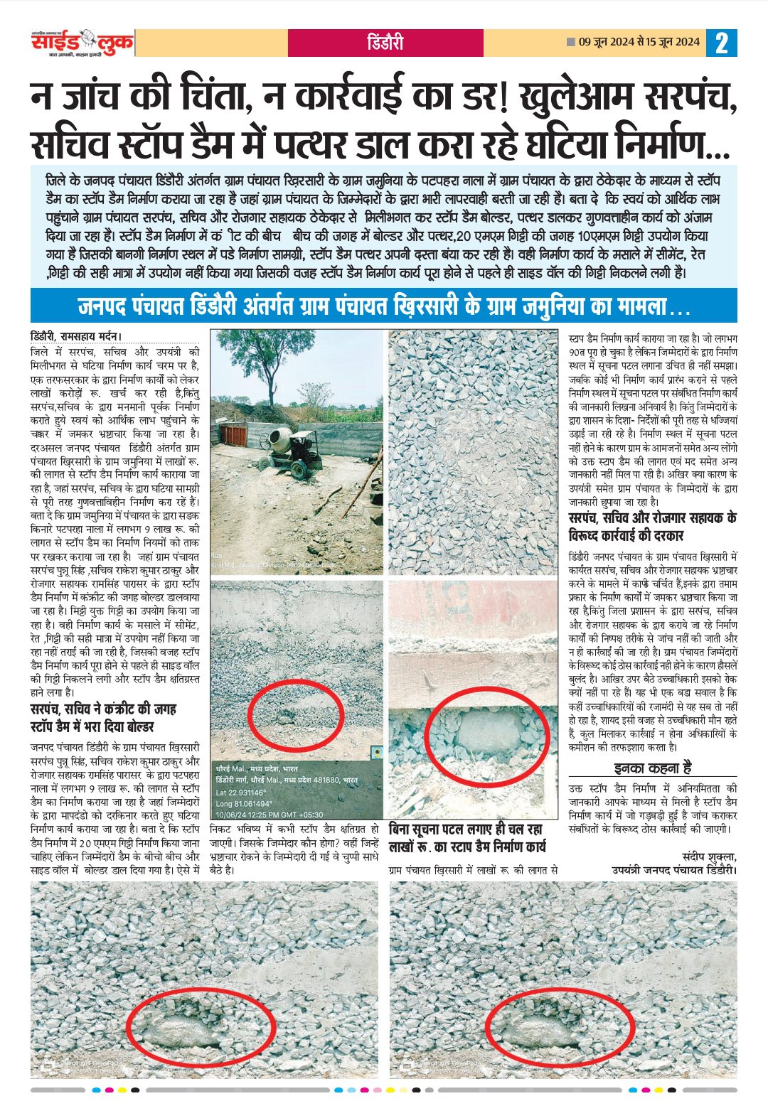 बता दें कि साईड लुक समाचार पत्र में विगत दिनों प्रकाशित खबर के बाद जिम्मेदारों के द्वारा निर्माण कार्य में सुधार करने की वजह आनन फानन लीपापोती कर निर्माण पूरा कर दिया गया, जबकि स्टॉप डैम निर्माण में अनियमितता की जनपद सीईओ व सहायक यंत्री डिंडौरी को दिया गया था , जिसपर जिम्मेदारों के द्वारा निर्माण कार्य की जांच करा कर सुधार करने की बात कही गई थी लेकिन न तो जांच हुई न ही निर्माण कार्य में सुधार बल्कि जल्दबाजी में घटिया सामग्री से स्टॉप डैम निर्माण कार्य को पूरा कर दिया गया।